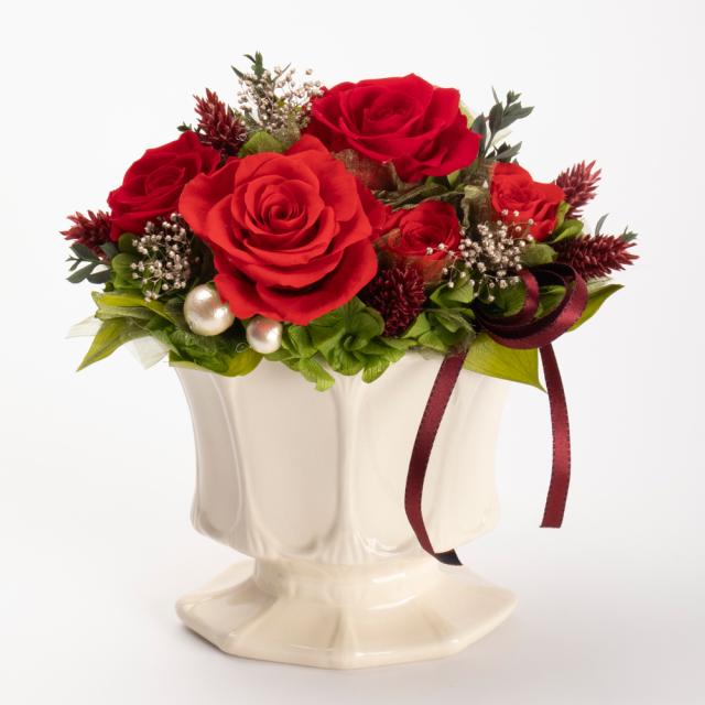 赤バラとリボンとパールが華やかなプリザーブドフラワーアレンジメントです。