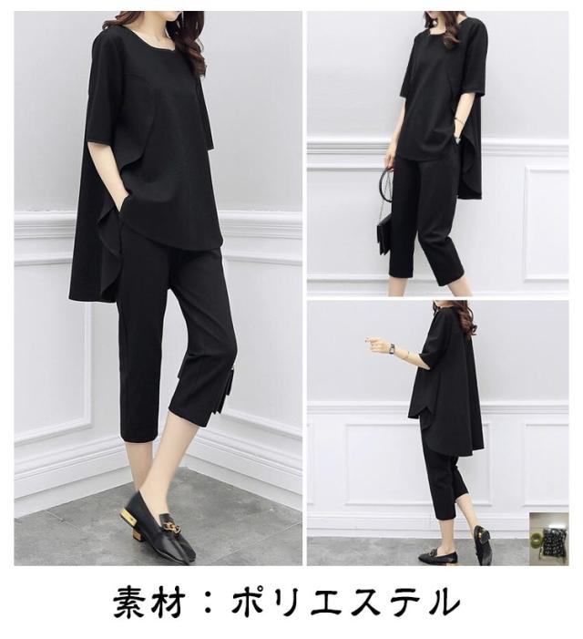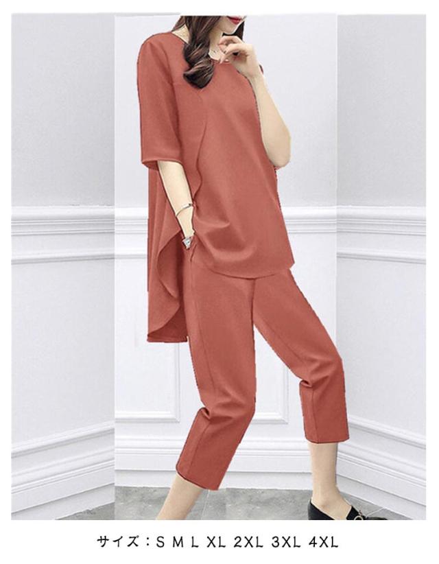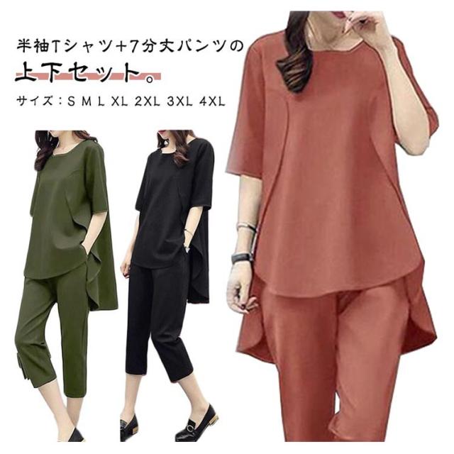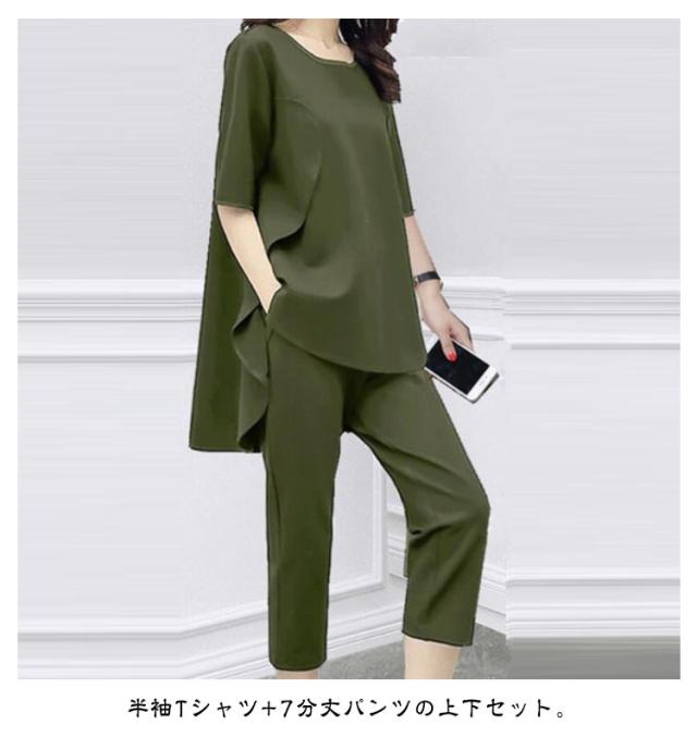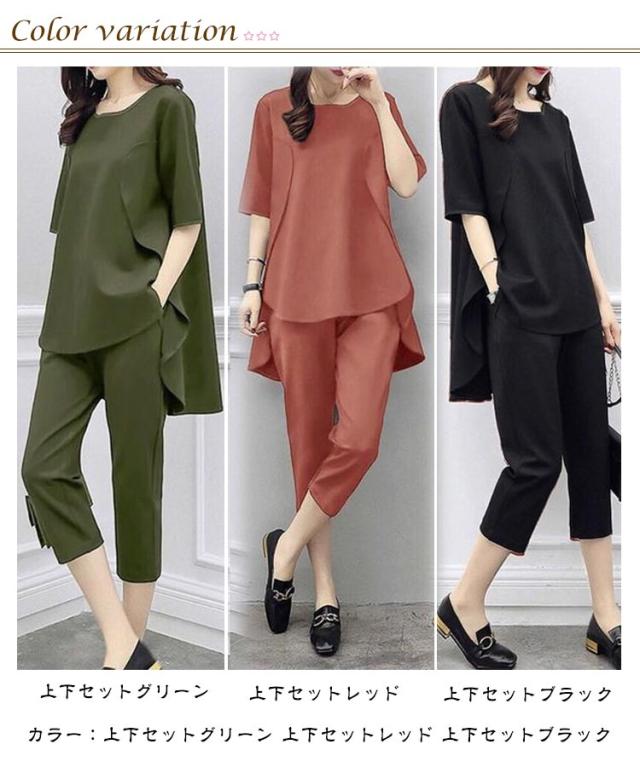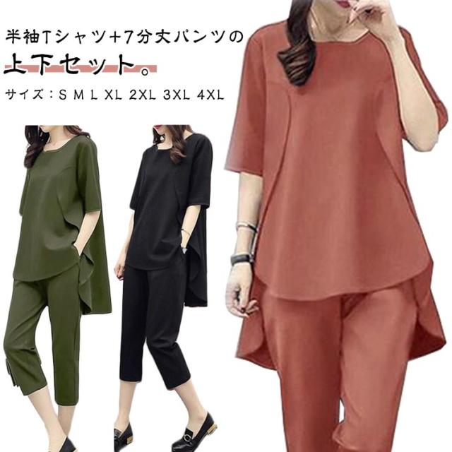 半袖 7分丈パンツ 上下セット レディース セットアップ 半袖Tシャツ 七分丈パンツ 韓国風 大きいサイズ Tシャツ トップス パンツ カジュアル シンプル 無地 着?せ 通勤 グリーン レッド ブラック 送料無料