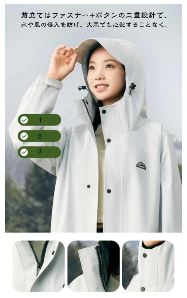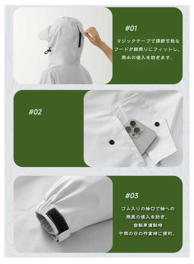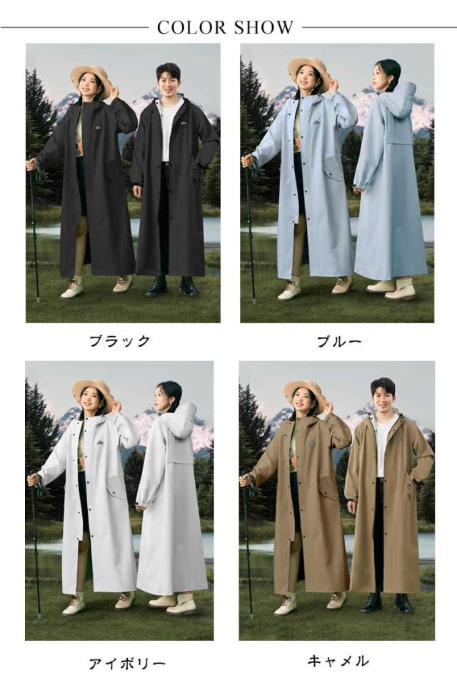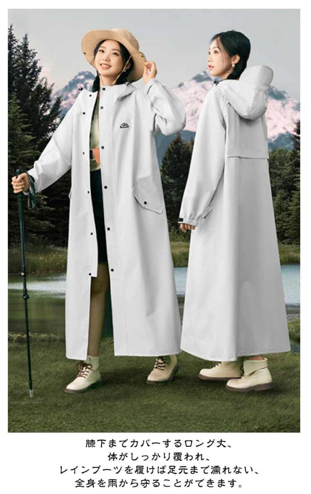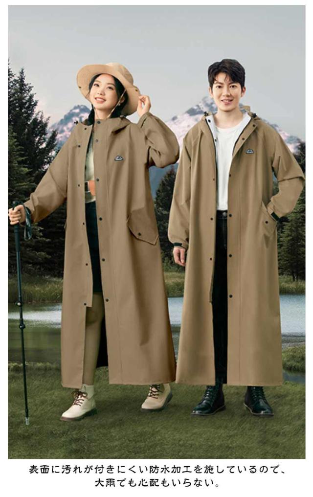 | 高い機能性とデザイン性を両立させた男女兼用のレインウェアです。 膝下までカバーするロング丈、体がしっかり覆われ、レインブーツを履けば足元まで濡れない、全身を雨から守ることができます。 ただのレインコートではなく、スタイリッシュなデザインで旅行時のジャケットとしても使えます。 表面に汚れが付きにくい防水加工を施しているので、大雨でも心配もいらない。 前立てはファスナー+ボタンの二重設計で、水や風の侵入を防げ、大雨でも心配することなく。 マジックテープで調節可能なフードが顔周りにフィットし、雨水の侵入を防ぎます。 ゴム入りの袖口で袖への雨風の侵入を防ぎ、自転車運転時や雨の日の作業時に便利。 通勤や通学、釣り、登山、キャンプなど、さまざまなアウトドアシーンにぴったりのアイテムです。 | |