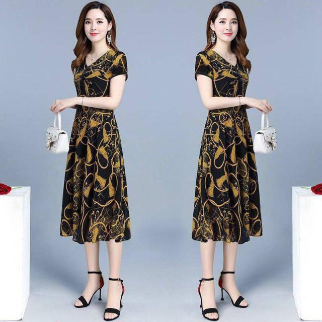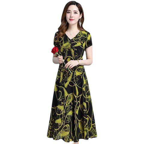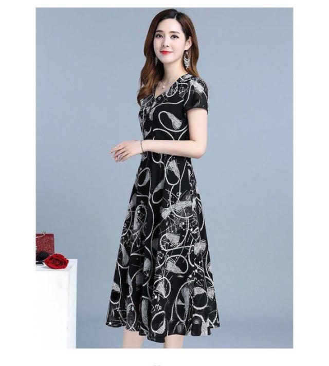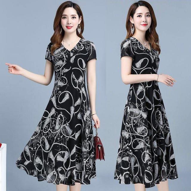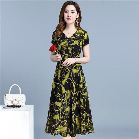 ワンピース Vネック 半袖 柄 総柄 クール 華やか 涼し気 ふんわり エレガント 母親 モダン おしゃれ お出かけ ママ 休日 女子会