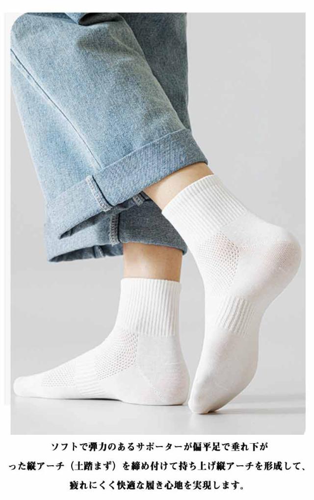 | アーチサポート付き・抗菌防臭・綿 抗菌防臭毎日汗をかいて活発に活動してもニオイが気になりにくい。 肌触り優しく、通気性抜群のコットンソックスは春夏も快適なメッシュタイプ登場! 綿素材のため、速乾性や防臭に優れていながらしっかりとした着用感を体感出来ます。蒸れやすい夏場でも、素早く汗を吸収して、外部に放出することで、足を快適でドライな状態に保ってくれます。 ソフトで弾力のあるサポーターが偏平足で垂れ下がった縦アーチ(土踏まず)を締め付けて持ち上げ縦アーチを形成して、疲れにくく快適な履き心地を実現します。 履き口部分が伸縮性が優れてる弾性リブデザインを採用して、締め付けがきつ過ぎず緩すぎず、快適なフィート感なってます。 日常生活はもちろん、スポーツをする際にも落ちにくく、室内外問わず快適に使えます。クォーター丈ショート丈より少し長めで、くるぶしが隠れる丈になり、スニーカーとの相性が良く、スポーツ時にも日常使いにも最適です。 | |