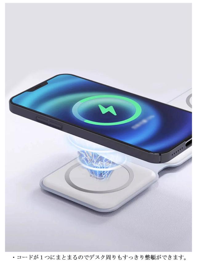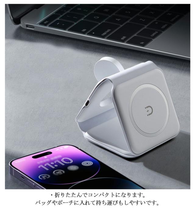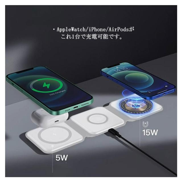 | ・3in1 折り畳み型ワイヤレス充電器 ・AppleWatch/iPhone/AirPodsがこれ1台で充電可能です。 ・折りたたんでコンパクトになります。バッグやポーチに入れて持ち運びもしやすいです。 ・コードが1つにまとまるのでデスク周りもすっきり整頓ができます。 | |