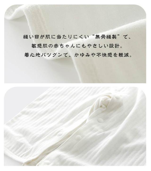 | 夏に嬉しい“接触冷感素材”を使用した、ひんやり気持ちいいベビー用ロンパース。 縫い目が肌に当たりにくい“無骨縫製”で、敏感肌の赤ちゃんにもやさしい設計。 着心地バツグンで、かゆみや不快感を軽減。 フロントにスナップボタンが付いているから、着脱やおむつ替えもラクラク。 ママ・パパにも嬉しい機能性! 長袖や薄手仕様なので、冷房対策・紫外線対策にもぴったり。 夏の室内でも安心して着せられるアイテムです。 シンプルでおしゃれなデザインだから、男女問わず使いやすい。 プレゼントやお祝いにも最適! | |