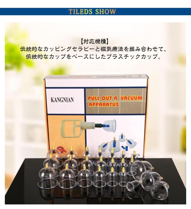 | 24個セット カッピング 吸い玉 【対応機種】 伝統的なカッピングセラピーと磁気療法を組み合わせて、伝統的なカップをベースにしたプラスチックカップ。 中国のカップのセット空の体の健康な医療吸引マッサージポンプ療法。自宅での自宅療養に使用するのが簡単で安全です。1日15分〜30分、肩や腰など疲れ、こりのあるところを吸引してください。 材料:非毒性の医療グレードの耐久性のあるプラスチック。ホースが付いているので多少のコツはいりますが背中も一人で行うことが出来ます。 プラスチック製のカップなので、割れやすいガラス製に比べ安全に使用できます。カップはお湯で沸かして消毒が可能、いつもきれいにご使用頂けます。 | |