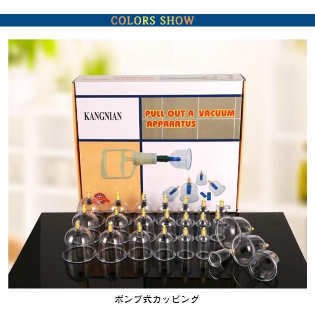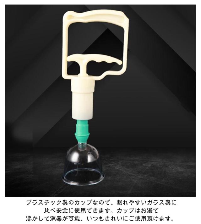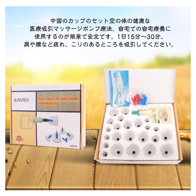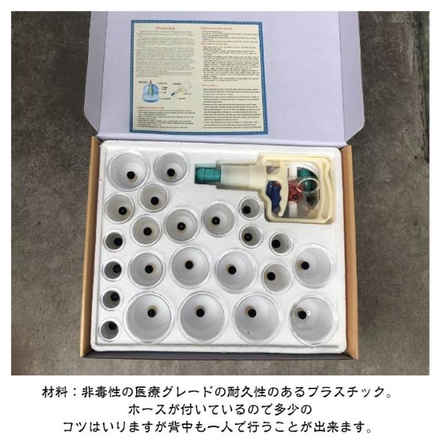 | 24個セット カッピング 吸い玉 【対応機種】 伝統的なカッピングセラピーと磁気療法を組み合わせて、伝統的なカップをベースにしたプラスチックカップ。 中国のカップのセット空の体の健康な医療吸引マッサージポンプ療法。自宅での自宅療養に使用するのが簡単で安全です。1日15分〜30分、肩や腰など疲れ、こりのあるところを吸引してください。 材料:非毒性の医療グレードの耐久性のあるプラスチック。ホースが付いているので多少のコツはいりますが背中も一人で行うことが出来ます。 プラスチック製のカップなので、割れやすいガラス製に比べ安全に使用できます。カップはお湯で沸かして消毒が可能、いつもきれいにご使用頂けます。 | |