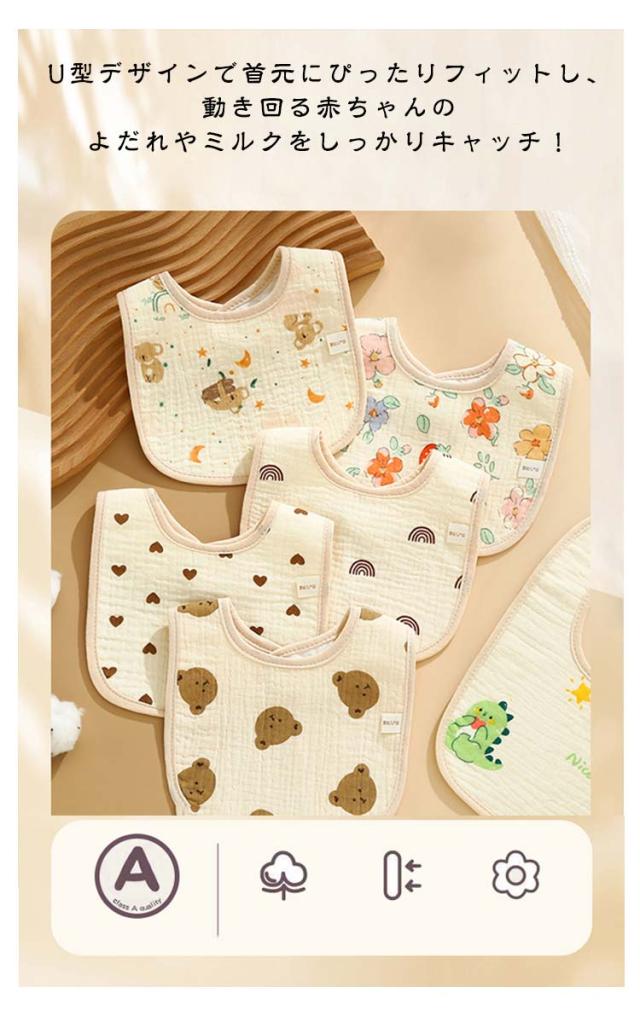 | U型デザインで首元にぴったりフィットし、動き回る赤ちゃんのよだれやミルクをしっかりキャッチ! 表面は吸水性の高いコットン素材、中間層は吸収層、そして裏面にはTPU防水素材を採用した三層構造。 防水性と通気性を兼ね備えた素材で、長時間の使用でも赤ちゃんが快適に過ごせます。 スナップボタン式の留め具はサイズ調整可能。急いでる時もサッとつけられて便利! 可愛い柄からシンプルな無地まで、男の子・女の子問わず使えるデザインで、毎日選ぶのが楽しくなる。 出産祝い・ベビーギフトにもぴったりの実用的アイテム。洗い替えに何枚あっても困らない! 食事中にも使えるので、離乳食デビューにもおすすめの万能ビブ。保育園やお出かけにも大活躍! | |