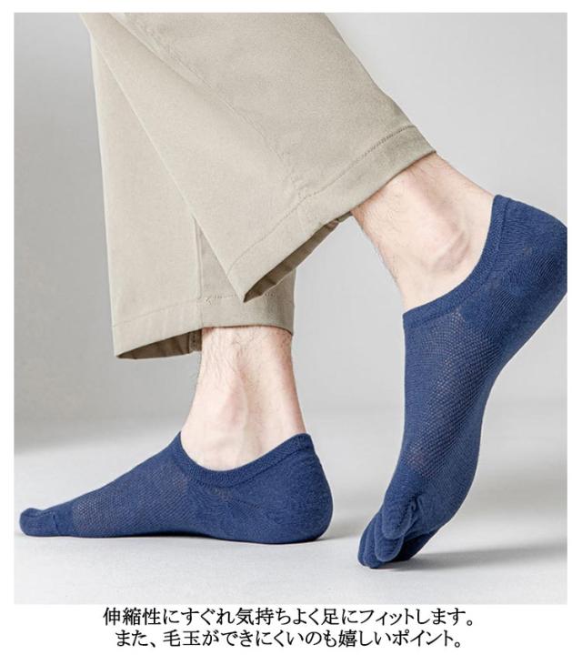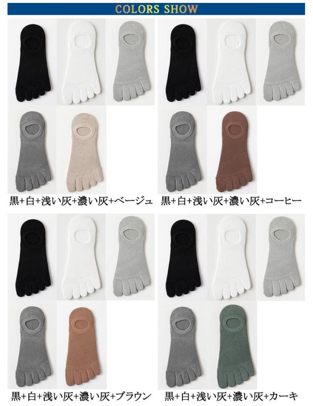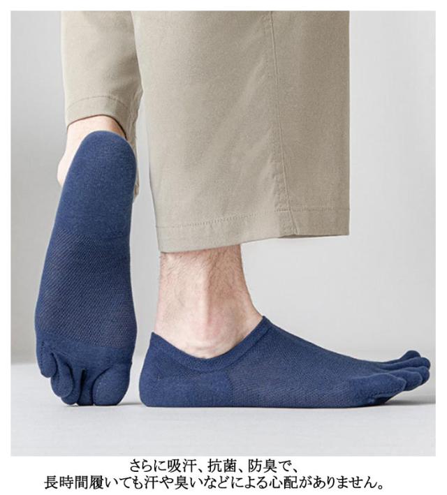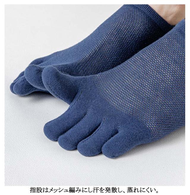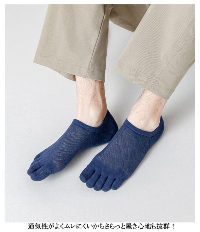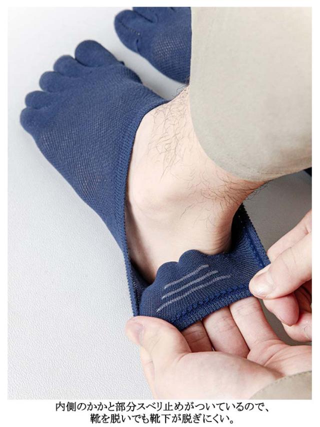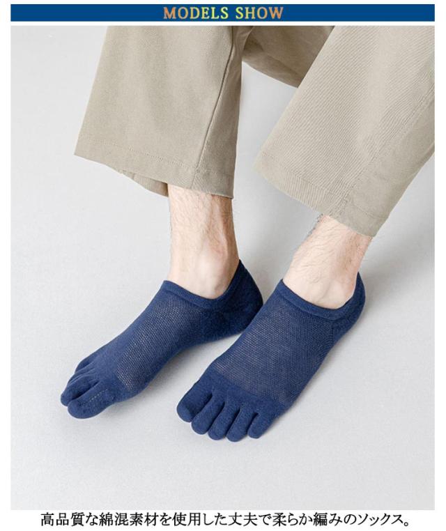 | 抗菌・防臭加工を施した五本指ソックス コットン混素材で履き心地も快適! 5足セット 高品質な綿混素材を使用した丈夫で柔らか編みのソックス。 指股はメッシュ編みにし汗を発散し、蒸れにくい。 通気性がよくムレにくいからさらっと屋き心地も抜群! 伸縮性にすぐれ気持ちよく足にフィットします。また、毛玉ができにくいのも嬉しいポイント。 さらに吸汗、抗菌、防臭で、長時間履いても汗や臭いなどによる心配がありません。 くるぶしソックスに比べて浅い作りなのでスニーカーとの相性も抜群でコーディネートの邪魔をしません。 内側のかかと部分スベリ止めがついているので、靴を脱いでも靴下が脱ぎにくい。 | |