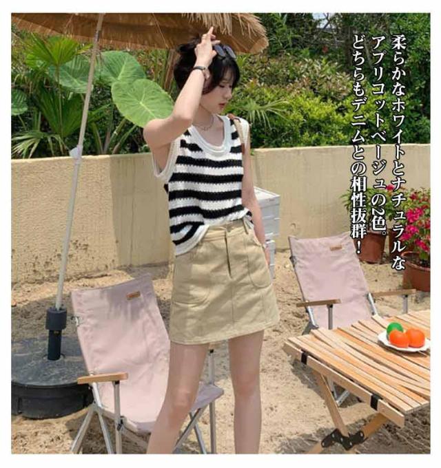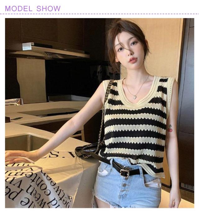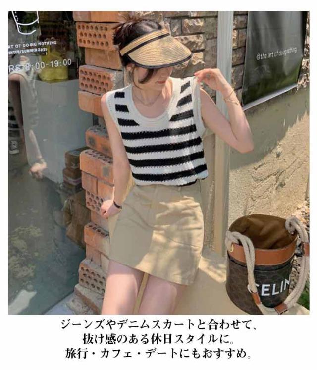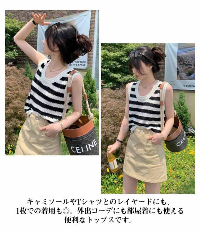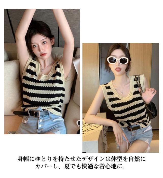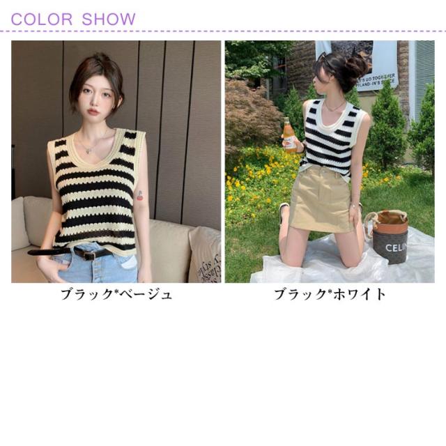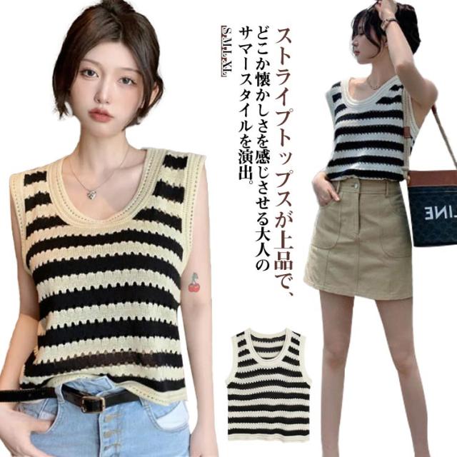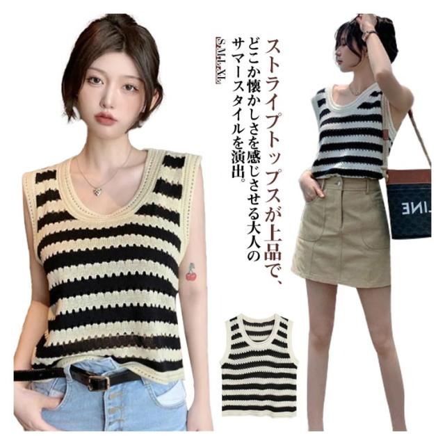 ニットベスト ノースリーブ ストライプトップス サマーニット 重ね着 透かし編み 着回し ベスト シンプル カジュアル ゆったりトップス 丸首 夏 外出用 レイヤード 肌触り良い ノースリーブ カジュアル