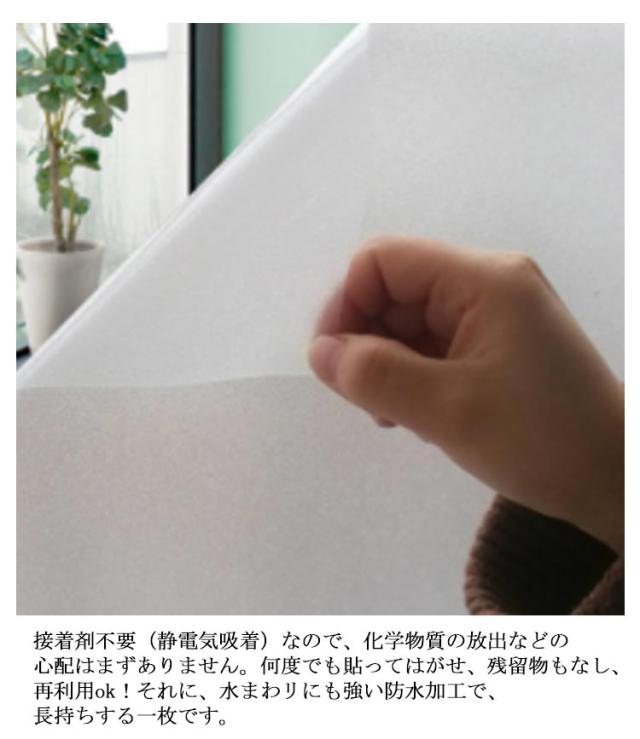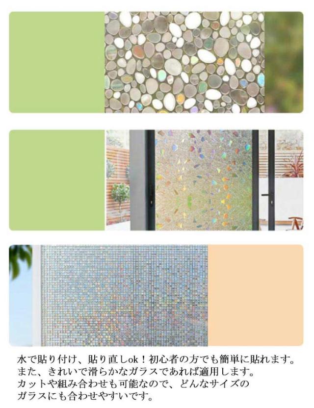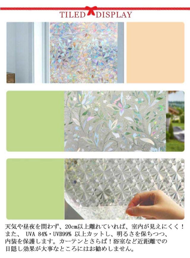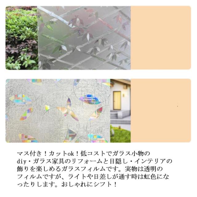 | 目隠し・日射調整・UVカット:天気や昼夜を問わず、20cm以上離れていれば、室内が見えにくく!また、 UVA 84%・UVB99% 以上カットし、明るさを保ちつつ、内装を保護します。カーテンとさらば!浴室など近距離での目隠し効果が大事なところにはお勧めしません。 残り物なし・賃貸ok:接着剤不要(静電気吸着)なので、化学物質の放出などの心配はまずありません。何度でも貼ってはがせ、残留物もなし、再利用ok!それに、水まわリにも強い防水加工で、長持ちする一枚です。 貼り付け簡単・落ちにくい:水で貼り付け、貼り直しok!初心者の方でも簡単に貼れます。また、きれいで滑らかなガラスであれば適用します。カットや組み合わせも可能なので、どんなサイズのガラスにも合わせやすいです。 ガラス小物のdiy・飾り・リフォーム:マス付き!カットok!低コストでガラス小物のdiy・ガラス家具のリフォームと目隠し・インテリアの飾りを楽しめるガラスフィルムです。実物は透明のフィルムですが、ライトや日差しが通す時は虹色になったりします。おしゃれにシフト! 遮熱・エアコンのコスト削減:チョッピリだけですが、冬は暖房で暖めた室内の熱を窓から外へ逃げるのを抑え、夏は暑い外気熱が室内へ流入するのを軽減し、日々の省エネ対策やにもなります。 | |
