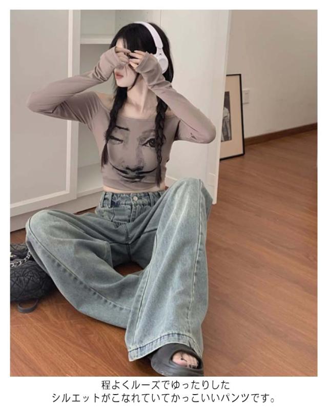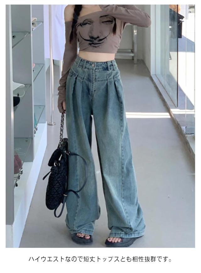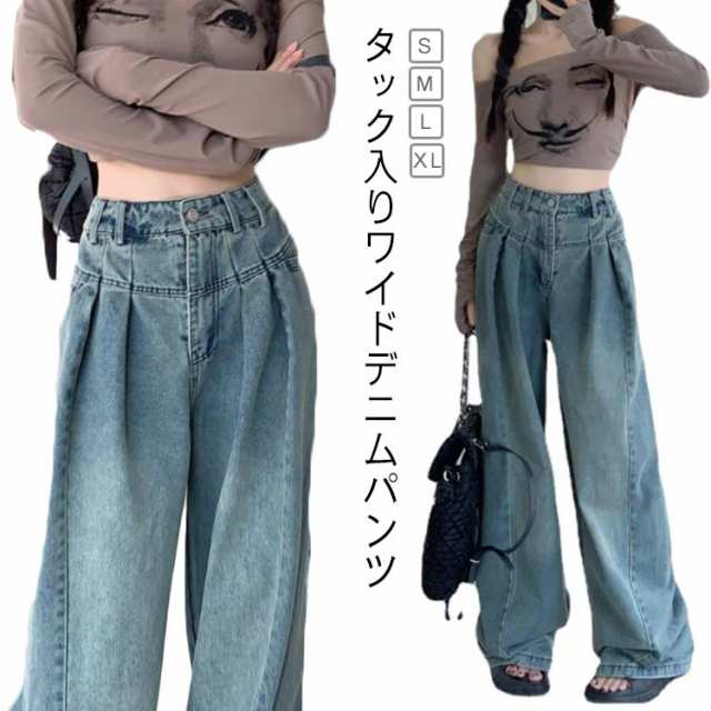 ゆったり バギー ルーズ ジーパン ワイド デニムパンツ デニム フレア タック入り レディース ジーンズ ハイウエスト ワイドパンツ かっこいい カジュアル ゆるめ ウォッシュ加工 美脚 大きいサイズ 韓国ファッション