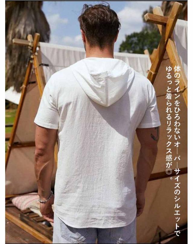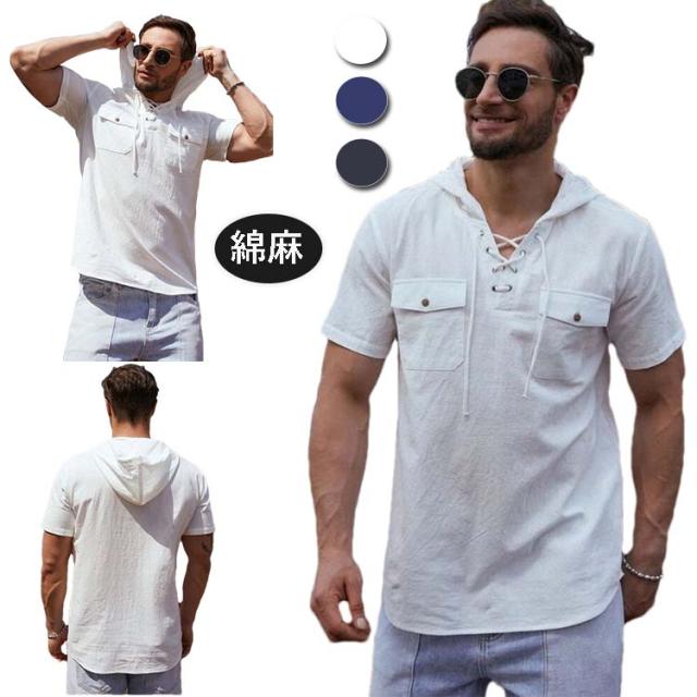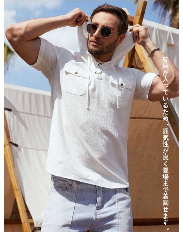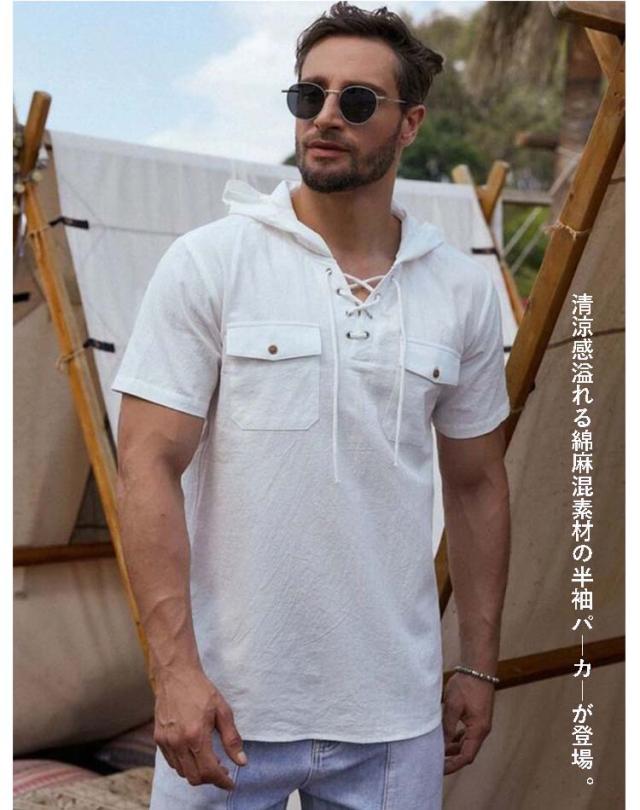 tシャツ 半袖パーカー リネン混 プルオーバーパーカー 麻混 コットンリネン メンズ フード付き 綿麻 パーカー 薄手 涼しい ボタン Tシャツ ポケット 半袖パーカー シンプル 無地 服 夏服 春 夏 トップス