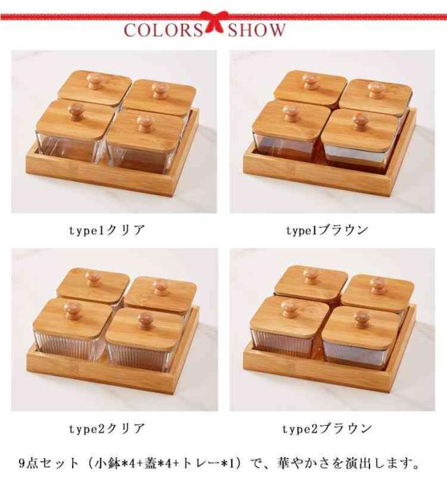 | サイズについての説明 | 9点(小鉢*4+蓋*4+トレー*1) 小鉢サイズ:8.8*5.4cm トレーサイズ:20*20cm 高約2.8cm ※天然竹を使用していますので、画像の色とは異なる場合があります。また、製品ひとつひとつの木目は異なります。 |