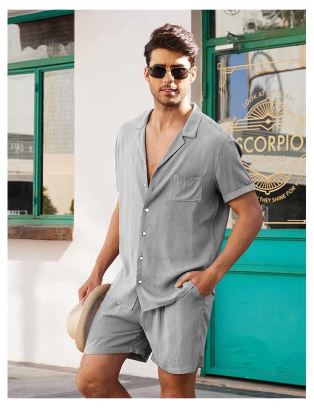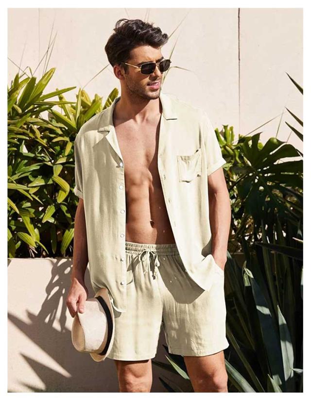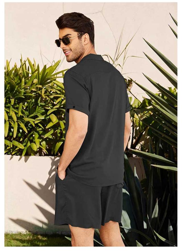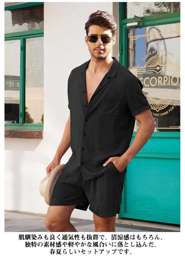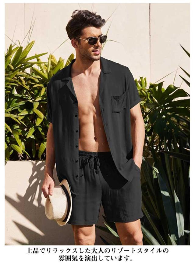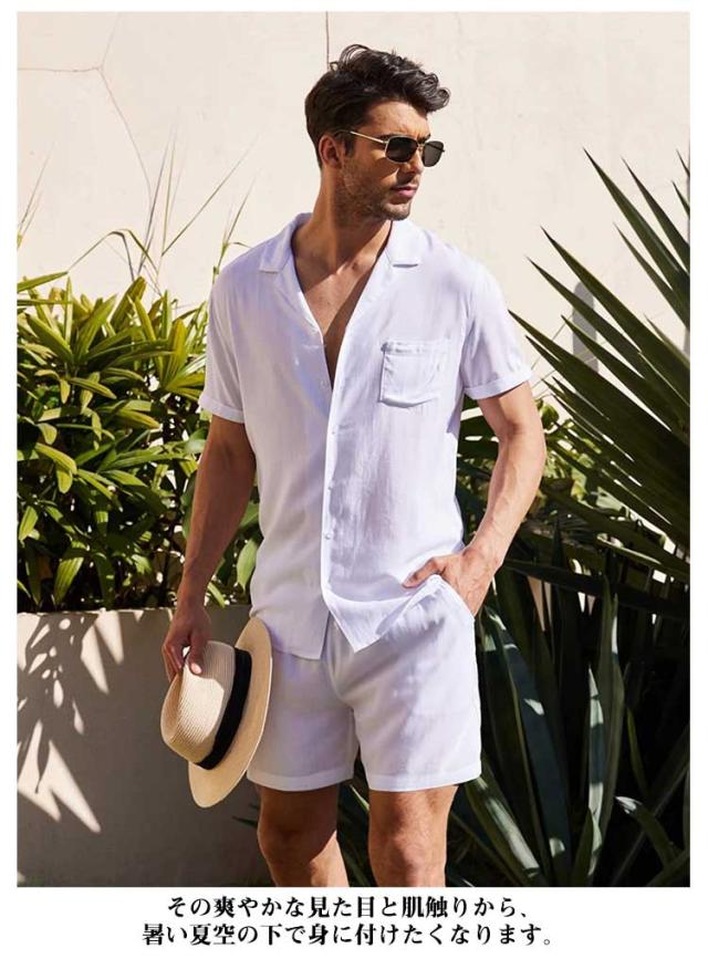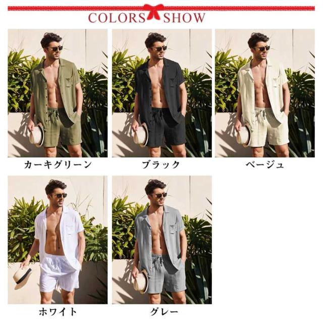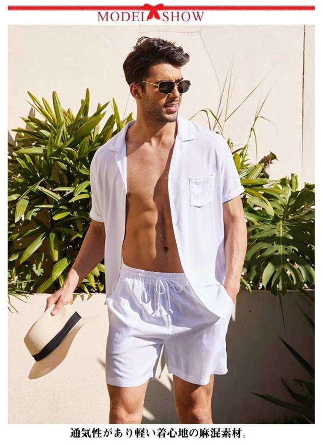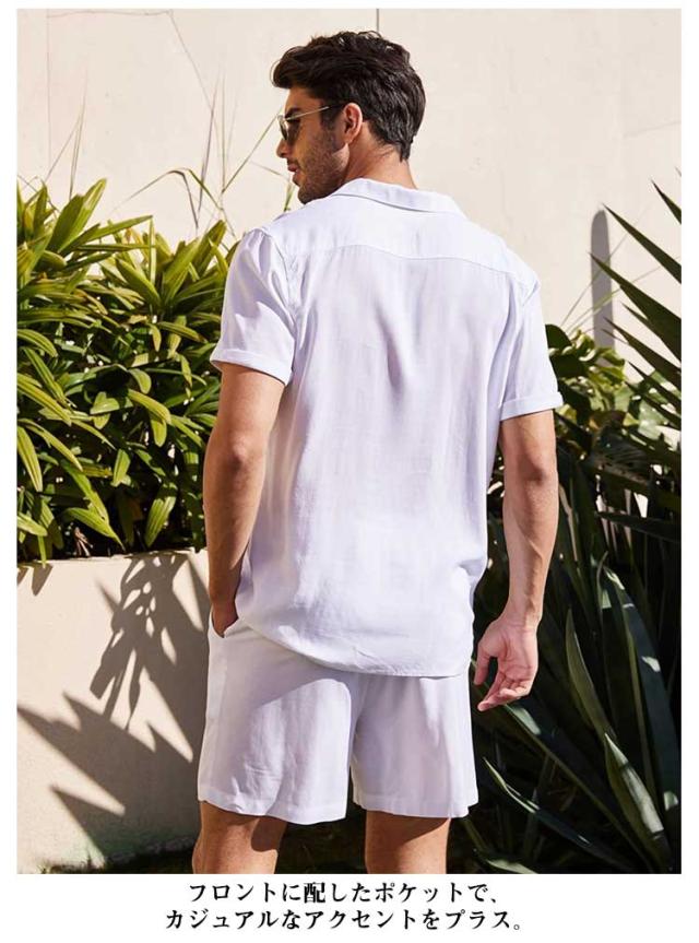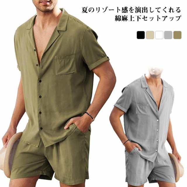 リネンシャツ 綿麻 メンズ 上下セット 半袖シャツ+ハーフパンツ セットアップ 前開き 胸ポケット ウェストゴム 膝上 短パン 涼しい ゆったり 薄手 リネン ストリート おしゃれ かっこいい 無地 単色 全5色