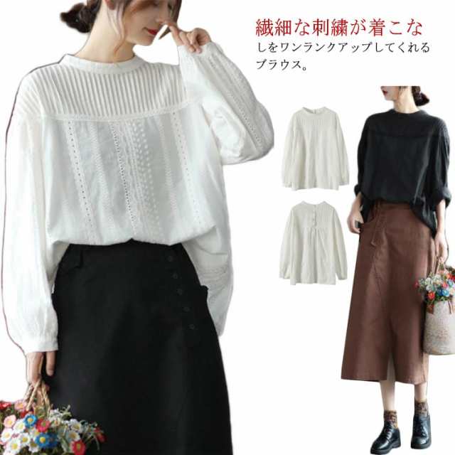 刺繍ブラウス 綿100% 長袖 レディース シャツ パフスリーブ 送料無料 バックボタン 春 秋 刺繍 レースブラウス おしゃれ トップス シャーリング バンディング きれいめ シンプル ふんわり 柔らか チュニック 通勤 オフィス 入学式 入園式 卒業式 卒園式 上品