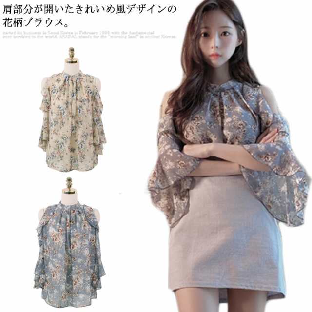 【送料無料】シフォンブラウス レディース 花柄 七分袖 肩あき フレアスリーブ オープンショルダー フリル ふんわり ギャザー トップス ゆったり 着痩せ 夏用