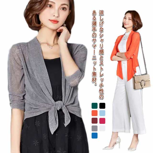 送料無料 ボレロカーディガン ショート丈 前結び レディース UV対策 ボレロ 裾しばり 冷房対策 薄手 ニットボレロ UVカット 透け感 7分袖 春夏 サマーカーディガン カーディガン