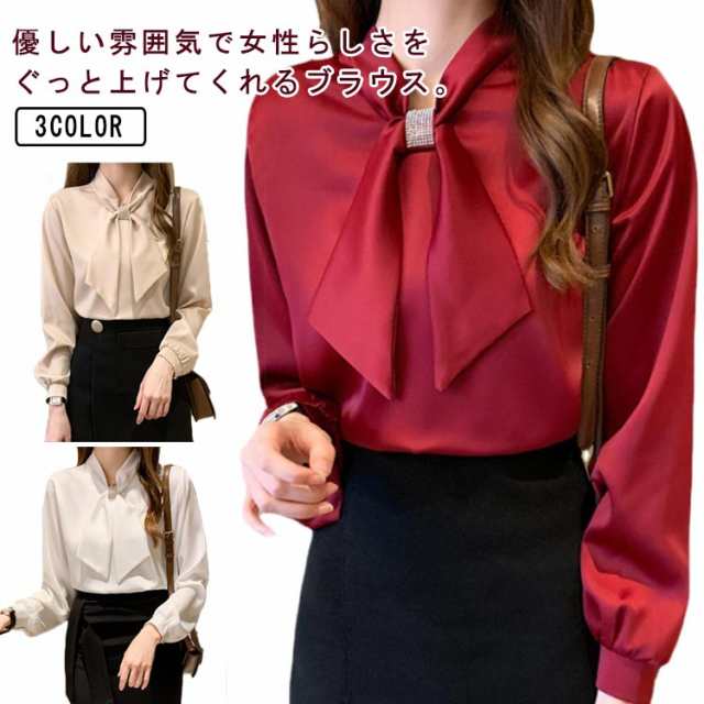 ブラウス リボン ボウタイブラウス 白 大きいサイズ サテン レディース オフィス 50代 通勤 40代 お仕事 ボウタイブラウス 30代 リボンタイ デイリー スカーフカラー トップス ホワイト 無地 シンプル 大人可愛い S M L XL 長袖