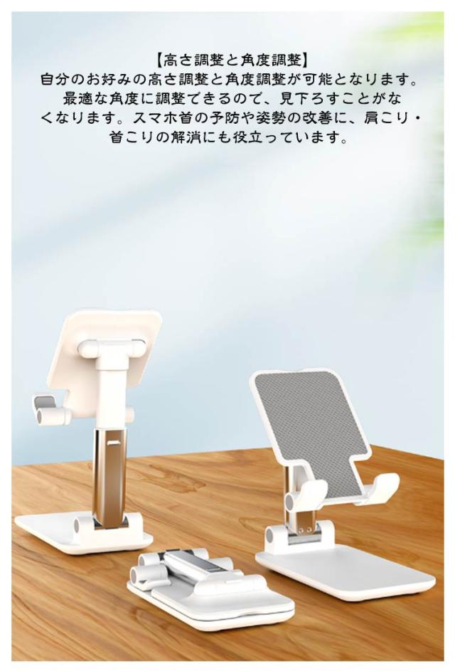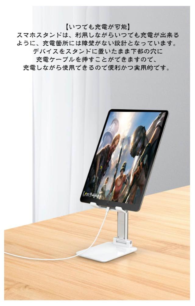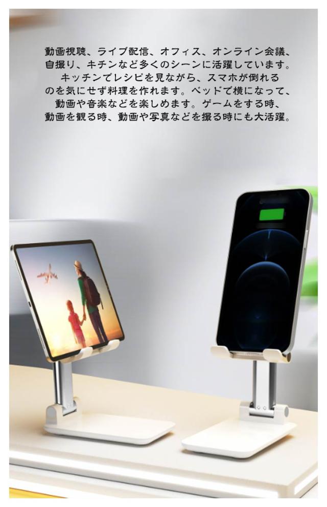 | 耐久性が高く、とても安定していてしっかりした製品です。 【高さ調整と角度調整】自分のお好みの高さ調整と角度調整が可能となります。最適な角度に調整できるので、見下ろすことがなくなります。スマホ首の予防や姿勢の改善に、肩こり・首こりの解消にも役立っています。 【いつでも充電が可能】スマホスタンドは、利用しながらいつでも充電が出来るように、充電箇所には障壁がない設計となっています。デバイスをスタンドに置いたまま下部の穴に充電ケーブルを挿すことができますので、充電しながら使用できるので便利かつ実用的です。 【滑り止め傷防止パット付き】滑り止めパットついてスマホ落下を防ぎます。 【折りたたみで持ち運びも楽々・収納便利】スマホスタンドは、通常のスマホサイズより小さく折り畳みが可能となるので、バッグなどに入れて外出や旅行時にも手軽に持ち運べます。手のひらのサイズくらいに折り畳むことができます。コンパクトでスペースを取らずポケットに入れて持ち運びが可能なので、外出や旅行にも最適です。また、重量も約105gとなるので、気軽に持ち運びが可能です。 【両手解放・多様なシーンで活躍】人間工学に基づいてデザインされており、最適な角度に調整し、両手を開放し、デバイスを安定して操作を楽しめます。動画視聴、ライブ配信、オフィス、オンライン会議、自撮り、キチンなど多くのシーンに活躍しています。キッチンでレシピを見ながら、スマホが倒れるのを気にせず料理を作れます。ベッドで横になって、動画や音楽などを楽しめます。ゲームをする時、動画を観る時、動画や写真などを撮る時にも大活躍。 | |