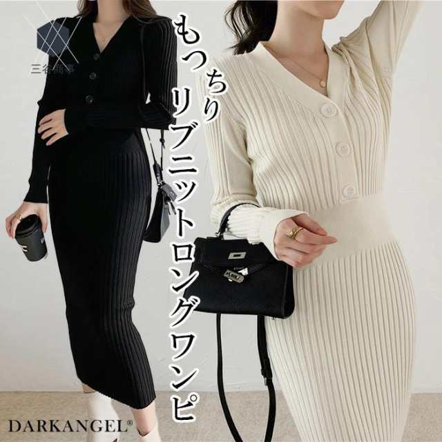 ニットワンピース ロング 秋 冬 秋冬 長袖 リブニット Vネック 黒 アイボリー レディース コットン 綿 タイト リブニットワンピース スリム ストレッチ 高伸縮 【もっちり リブニットロングワンピ】ダークエンジェル