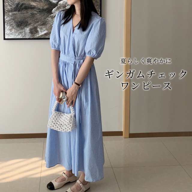 春新作 Vネック ワンピース レディース 春 夏 カジュアル 半袖 薄手 ロング ノーカラー レトロ ギンガムチェック 前開き カシュクール