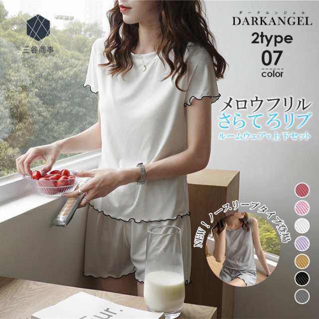 さらてろ 涼感 ルームウェア 楽ちん リブ セットアップ フリル ショーツ ウエストゴム 上下セット ワンマイルウェア 部屋着 半袖 夏 かわいい【 バイカラーメロウフリルさらてろ涼感ルームウェア 】 ダークエンジェル