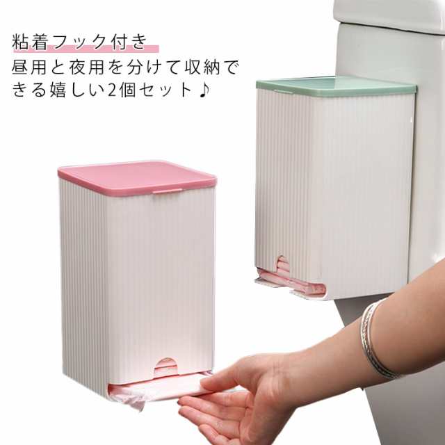 | 昼用と夜用を分けて収納できる嬉しい2個セット♪ 生活感を抑えてお洒落なナプキンストッカー、られたくないサニタリー用品をおしゃれに収納! 防水タイプの強力粘着フックが付属していますので、置いても、壁に取り付けても使えるから、場所を取らず、省スペースのサニタリー収納ケースです。 上から入れて、下のスリットから1枚ずつ取り出せます。 フタ付きなのでほこりなどを防いでくれます! ナプキン収納だけでなく、レジ袋やクレンジングシートなど、小物の収納にも便利です。 | |