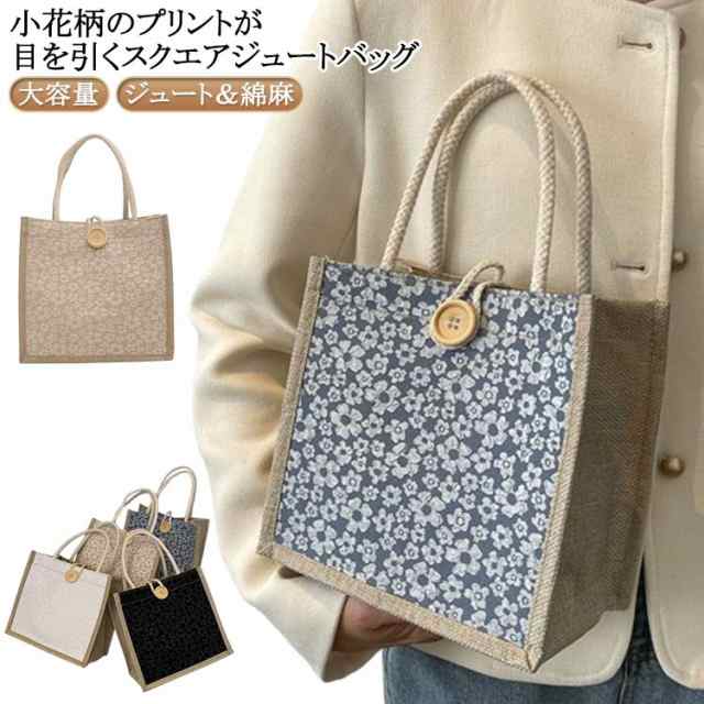| 麻の一種であるジュートを使用した流行のトートバッグ。 サブバッグとしても使い勝手の良いA4サイズが入る大きさ。 ミニサイズのレジ袋のようなカタチ!必要最低限の小物を入れて、身軽にお出かけ♪ 財布や化粧ポーチ、ペットボトル、タブレットなどを持ち運べる丁度いいサイズ感も魅力的! 毎日のお買い物や旅行や出張時など、カバンに常備していればとっても便利です。 手提げ、腕掛けや肩掛けなど、いろんな持ち方を楽しめるコーデの幅が広がる。 生地の裏側にはコーティング加工、多少の防水性があるので急な雨にも安心! | |