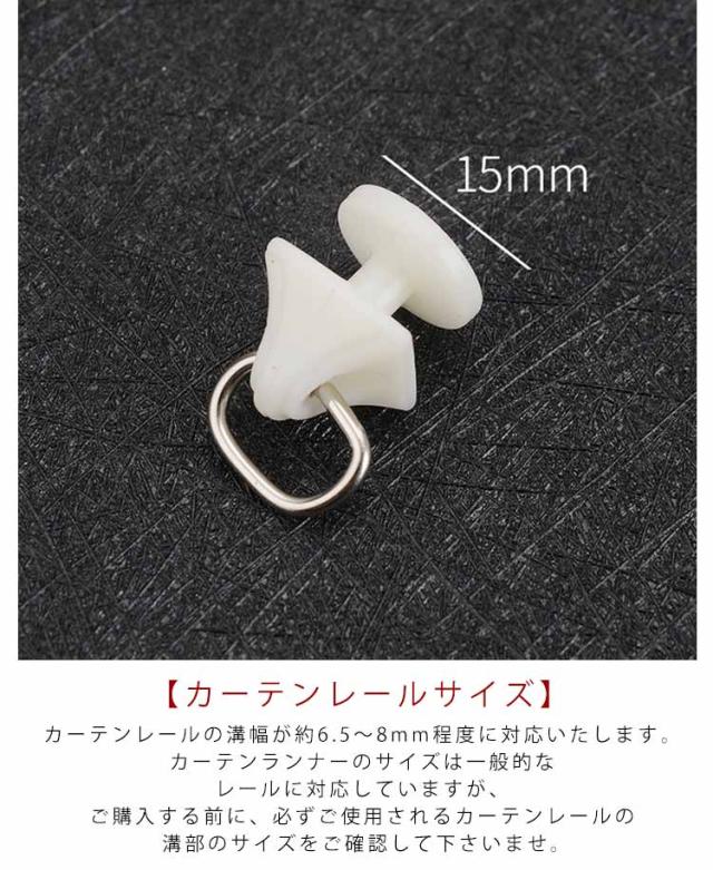 | 【高耐久性】 カーテンランナーは樹脂とステンレス鋼を素材としていますので、耐食性が高く、直射日光や冷気等で変形することはありません。樹脂製のため滑りやすく、ストレスなくカーテンを開閉することができます。 【カーテンレールサイズ】 カーテンレールの溝幅が約6.5?8mm程度に対応いたします。カーテンランナーのサイズは一般的なレールに対応していますが、ご購入する前に、必ずご使用されるカーテンレールの溝部のサイズをご確認して下さいませ。 | |