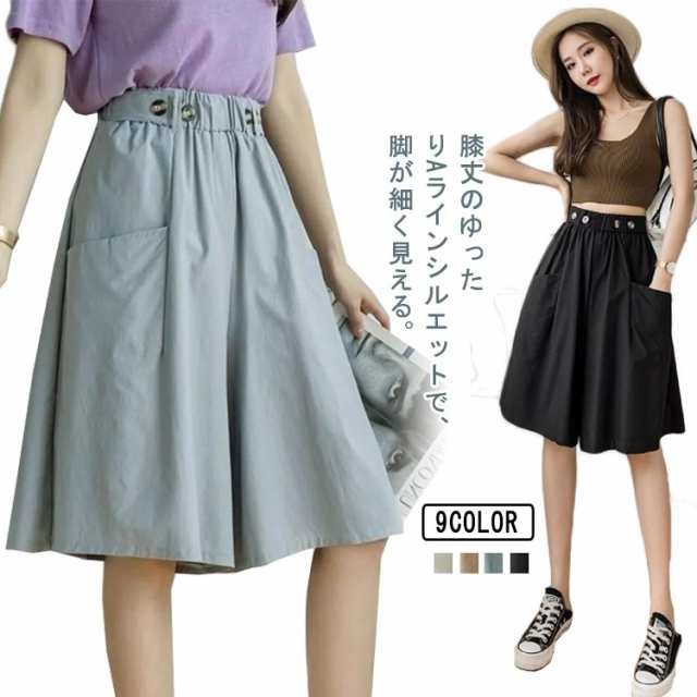 送料無料 ハーフパンツ レディース スカート風 ショートパンツ 薄手 膝丈 五分丈 キュロットパンツ ガウチョパンツ スカーチョ キュロットスカート ショート丈 ゆったり Aライン ボトムス 春 夏 春夏 ハイウエスト ウエストゴム 通勤 通学 カジュアル キレイめ