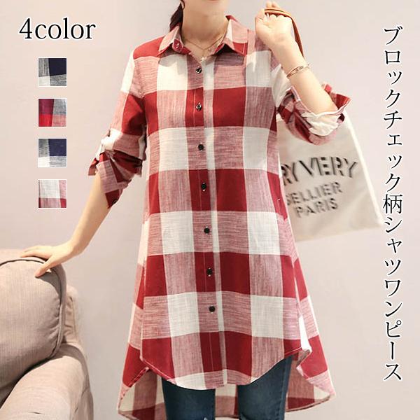 チェックシャツ ブロックチェック ロングシャツ チェック柄 シャツブラウス シャツワンピース レディース トップス