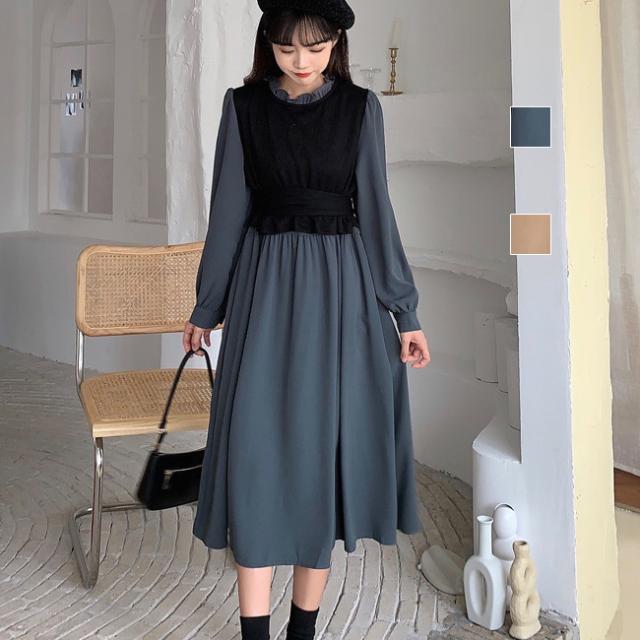 ワンピ ワンピース Aラインワンピ ゆったりワンピース 重ね風 レイヤード ハイウエスト Aライン フリル ミモレ丈 長袖 レディス レディース 秋冬 新作