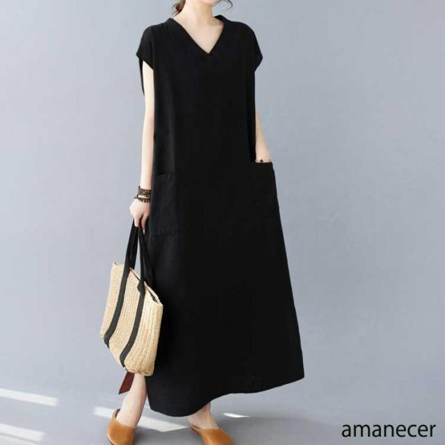 ワンピ ワンピース ロング丈ワンピ ロングワンピース マキシ丈 Vネック 左右ポケット ゆったり 無地 体型カバー レディス レディース 夏 新作