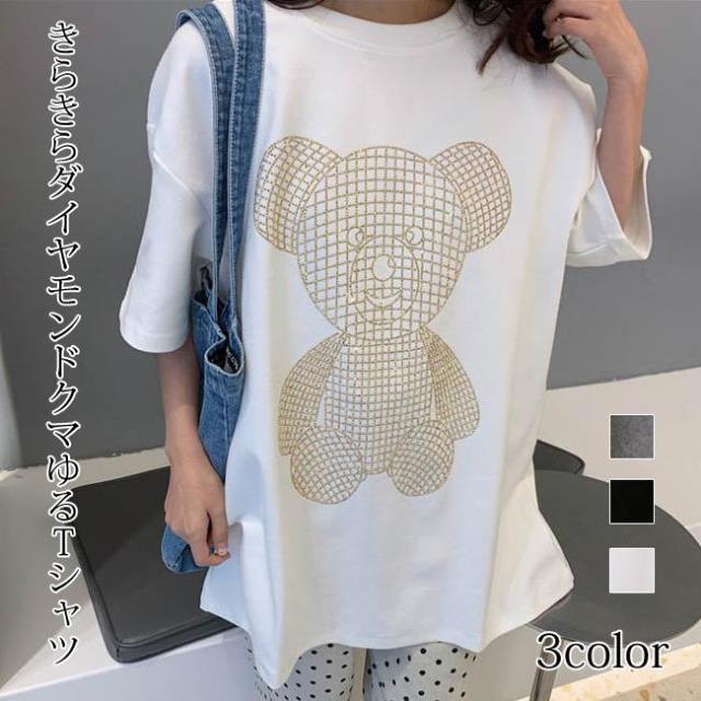 Tシャツ ゆるT くま フェイクダイヤモンド飾り ゆったり きらきら ゆるトップス 半袖 レディース トップス