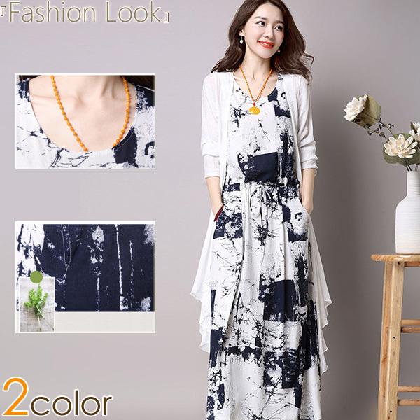 ワンピース 民族風ワンピース カーディガン 羽織り 2点セット ノースリーブワンピース 麻綿混紡