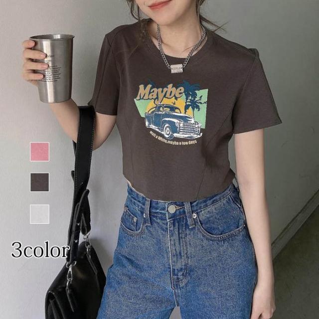 Tシャツ ショート丈 英字 ラウンド襟 半袖 夏Tシャツ レディース トップス