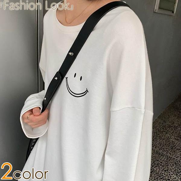 Tシャツ トップス プルオーバー 無地 シンプル 黒 白 スマイル ゆったり 長袖 レディース