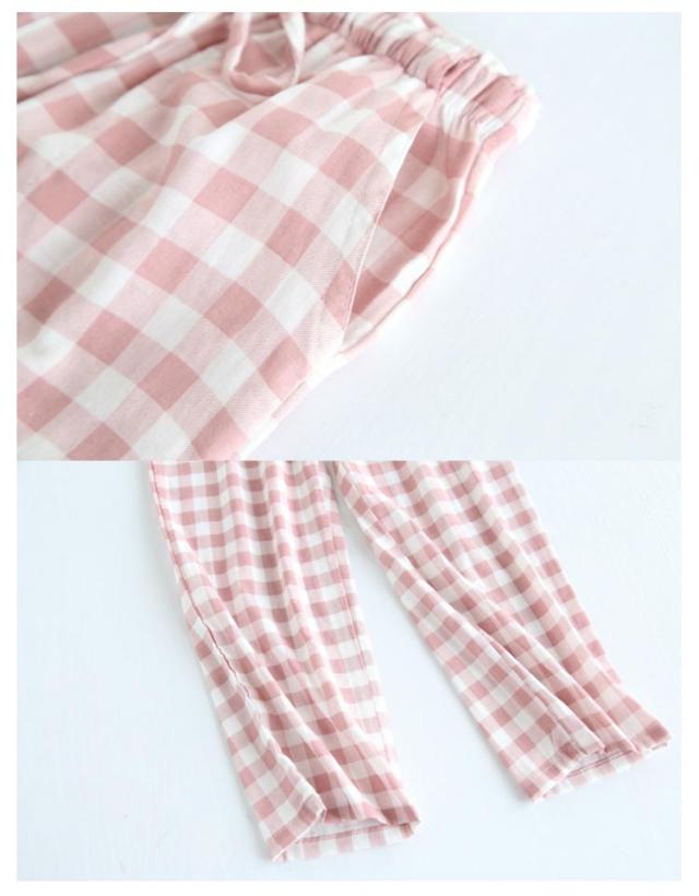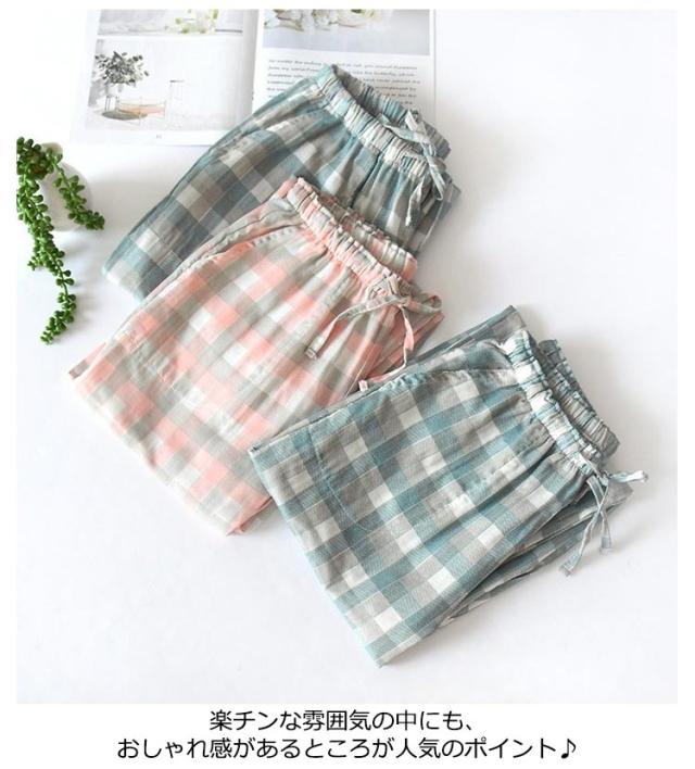 | 男女兼用 定番のチェック柄、素肌にやさしくなじむ安心なダブルガーゼルームパンツ。 汗をかきやすい春夏シーズンにも最適のコットン素材 楽チンな雰囲気の中にも、おしゃれ感があるところが人気のポイント♪ | |