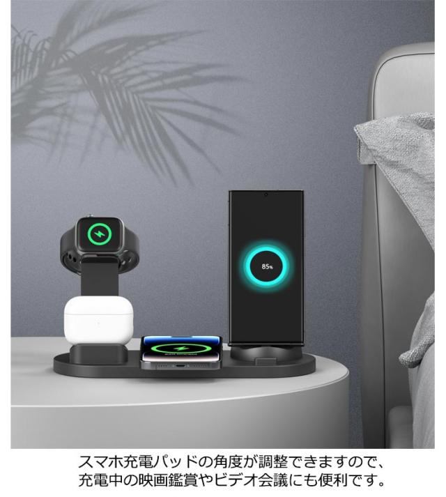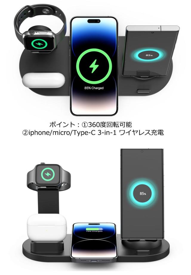 | 3in1 置くだけ! ワイヤレス充電器 3in1で、3種類デバイスを同時にまとめて充電し、机の上が綺麗な状態となります。 スマホ充電パッドの角度が調整できますので、充電中の映画鑑賞やビデオ会議にも便利です。 ポイント:1.360度回転可能 2.iphone/micro/Type-C 3-in-1 ワイヤレス充電 | |