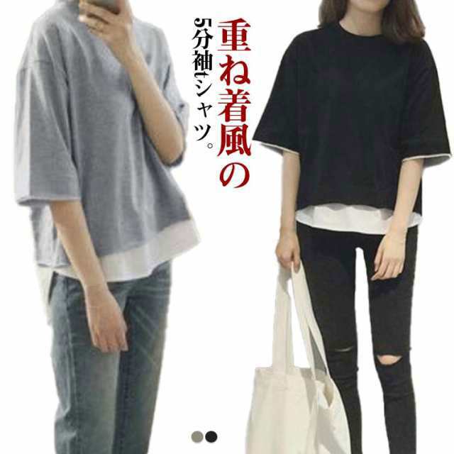 7分袖tシャツ 七分袖 七分袖 tシャツ レイヤード レディース 重ね着風 トップス 半袖 5分袖 ラウンドネック 切り替え 可愛い