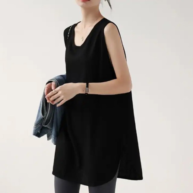 2枚セット!タンクトップ トップス レディース レイヤード ノースリーブ Uネック インナー タンクロング ロング丈 タンク ワッフル生地 スリット 2枚セット!タンクトップ 透けにくい ラウンド裾 無地 大きいサイズ チュニック 体型カバー 白 黒