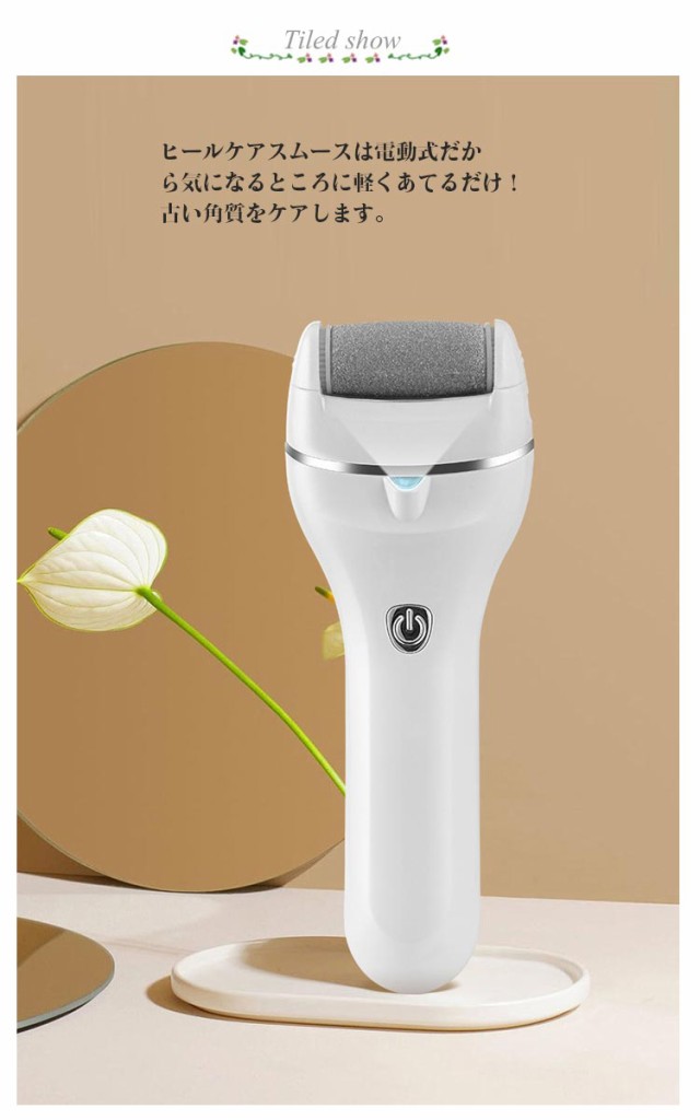 | ヒールケアスムースは電動式だから気になるところに軽くあてるだけ! 古い角質をケアします。 ローラー360°マッサージ&リペア 3段階のスピードでインテリジェントな角質除去 2週間に1回のケアで足裏滑らか ヘッド部分は水洗い可能 お手入れ簡単で清潔な状態を保ちます ボタンを押すだけ!付け替えラクラク LEDライトで足元を照らします。LEDバックライト設計!隅々まで脚の角質を見落とさない。 角質リムーバー使用時、暗い場所では綺麗に角質や タコを除去することができません。 その悩みを解決 するべく、バックライトを設計することにしました。 約1時間でスピード充電 USB接続による充電式で さらに使いやすい。 環境に優しいリチウム電池内蔵、約1時間でフル充電。 お客様のためのこだわり設計!ワンクリック式ボタン。ボタンで電源ON/OFF。スピーディーな操作で便利! USB接続で充電できる。電源コードの束縛から解放!いつでもどこでも使える新体験! 研磨ヘッド交換ボタン。両側のボタンを押すと研磨 ヘッドを取り外すことができます。 ヘッド部に角質がつきっぱなし。そんな事はありません。丸ごと水洗い出来て綺麗に保管できます。 ※充電ランプが赤色に表示されますと、止まり易くなりますのでしっかりと充電してお使いください。 | |