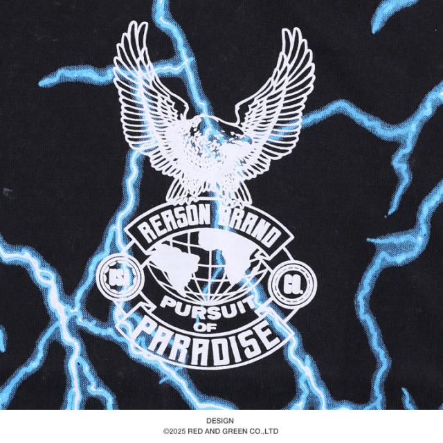 フロントには、アメリカを象徴するイーグルと共に、英字メッセージをドロップ。ボディ全域には、リアルな雷の総柄デザインをオン。