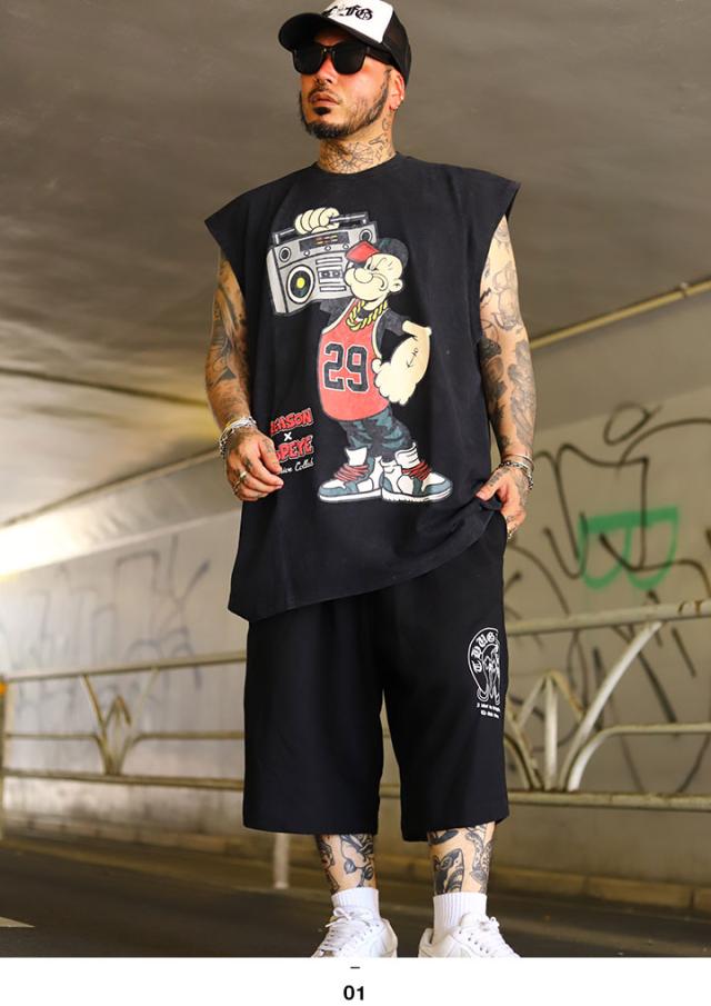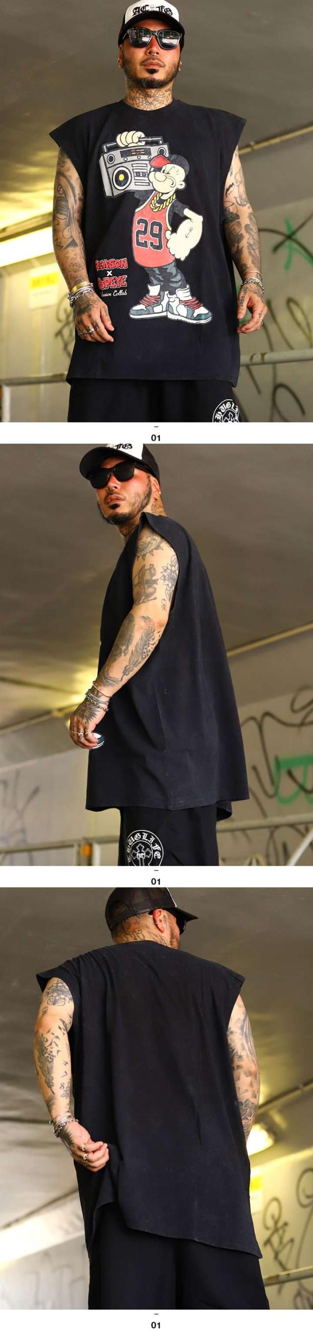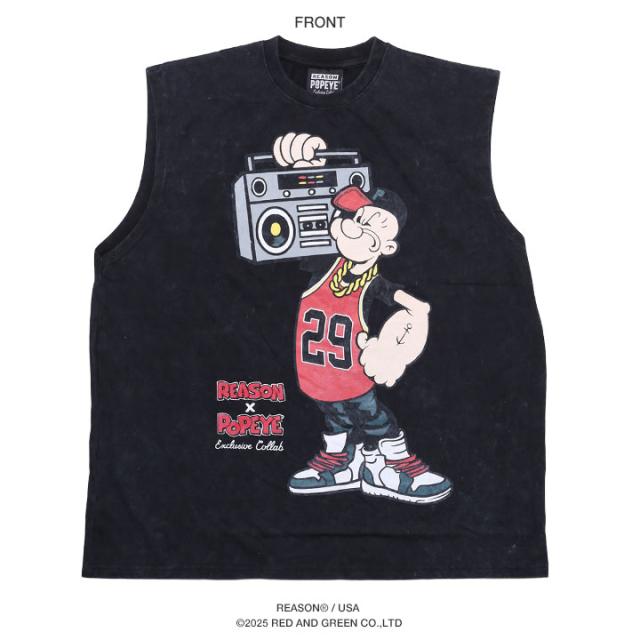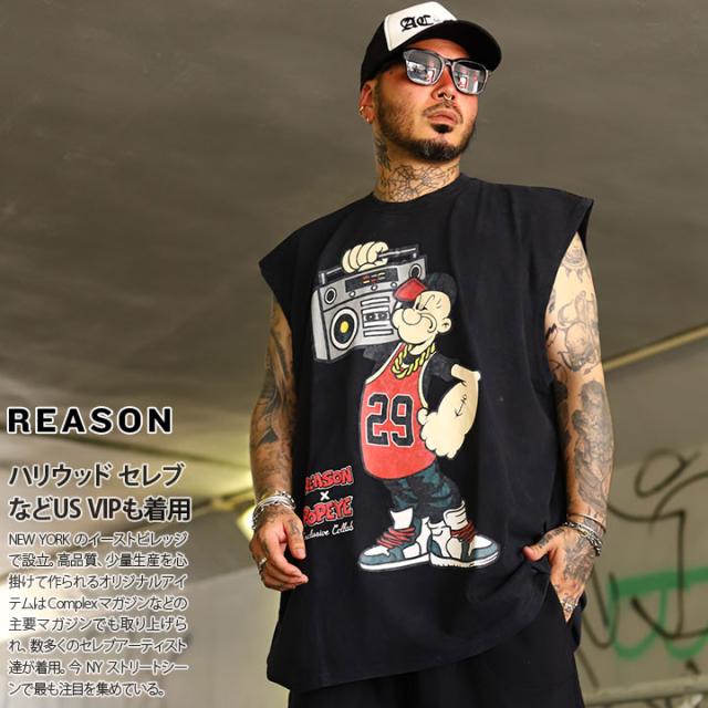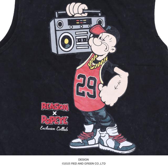 【40%OFF】REASON × ポパイ Tシャツ 半袖 メンズ 黒 Popeye 限定 コラボ 公式 リーズン 派手 総柄 黒シブ 渋黒 ノースリーブ 袖なし タンクトップ オーバーサイズ ビッグシルエット b系 ヒップホップ ファッション ストリート系 ブランド 服 2025春夏 POP63