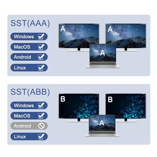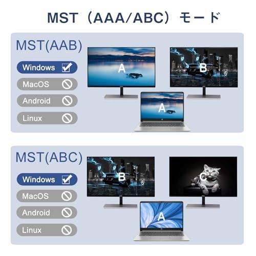 【MSTモードと分配モード】1.MSTモード(拡張モード):SSTモード、A-B-B/A-B-Cモードを含む。 2.分配モード(ミラーモード):A-A-A。このDisplayport分配器 1入力2出力モニターアダプターは、拡張モードとミラー