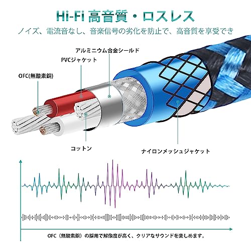 【HiFi高音質】紛失を防止の螺旋設計の24k金メッキコネクタとOFC(無酸素銅)芯線を採用のため、信号劣化・接続不良を防ぎ、信号の歪みの発生や伝送ロスを抑え、本音の聴覚体験を可能です。2重シールドに加えて外部干渉により強く、最大限外部ノイズ・タッチノイズを抑え、クリアなステレオサウンドが可能です。