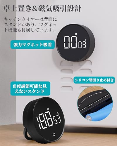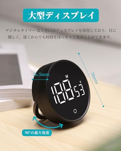 デジタルキッチンタイマー ビジュアルタイマー 大きなLEDディスプレイ 無音タイマー 磁気カウントダウンタイマー 199分 カウントアップ / ダウンタイマー 卓上置き 壁掛け 教室 / 料理 / フィットネス / ベーキング / 勉強 / 教授 子供や高齢者に簡単(ブラック)