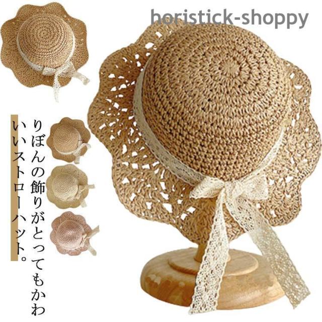 子供 麦わら帽子 ハット つば広 ストローハット 中折れ リボン付き レース 可愛い 折り畳み キッズ 帽子 女の子 子供 小学生 幼稚園