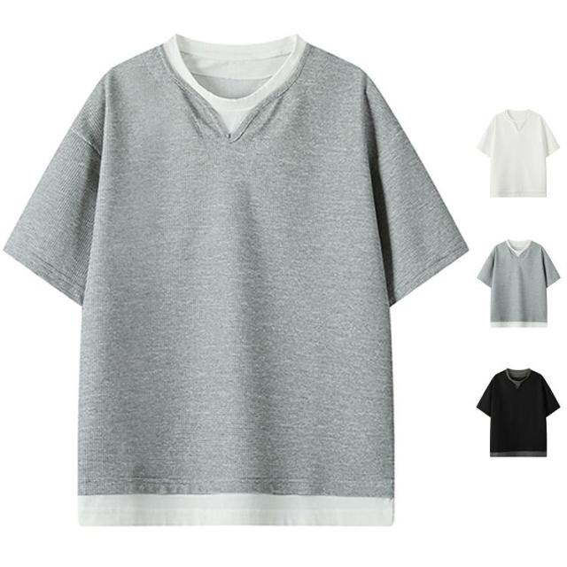 tシャツ メンズ 半袖tシャツ 半袖 Tシャツ Vネック トップス フェイク レイヤード 重ね着 夏物
