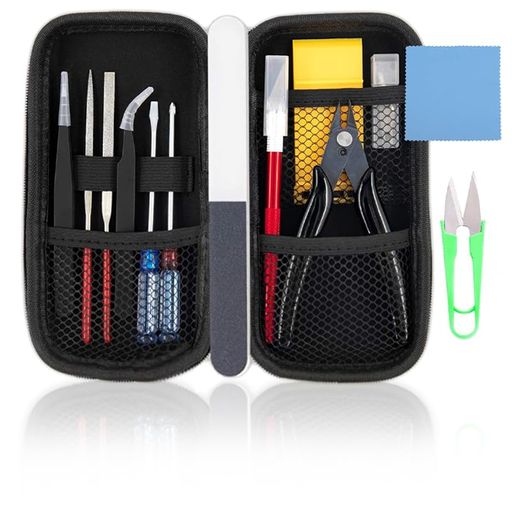 【14点 プラモデル用工具】:精密ストレートタイプ ピンセット×1、曲線型ピンセット精密 ×1、プラモデル ニッパー ×1、ダイヤモンドヤスリ×2、モデラーズナイフ×1、替え刃5枚付き X1、サンドスティッ×1、ドライバー ×2、雑巾×1、収納ケースX1、はさみX1、スクレ一パ一 X1。