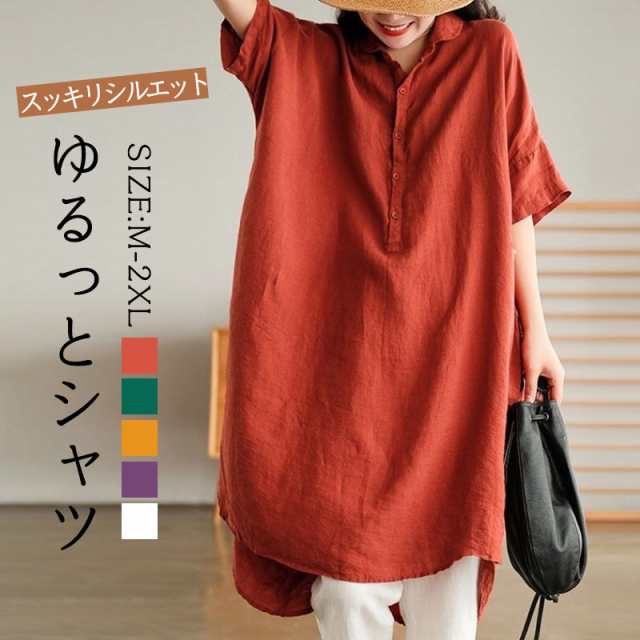 チュニック シャツワンピース ロングシャツ レディース 半袖 シャツ 綿麻 オーバーサイズ ロング丈 無地 シンプル 着痩せ 体型